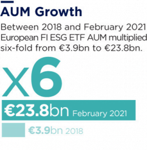However, times are changing fast and there is growing investor demand for ESG fixed income solutions. For example, between January 2018 and February 2021 assets under management in European fixed income ESG ETFs increased by six times to € 23.8 billion. So what has brought about this change and what opportunities does this bring?
